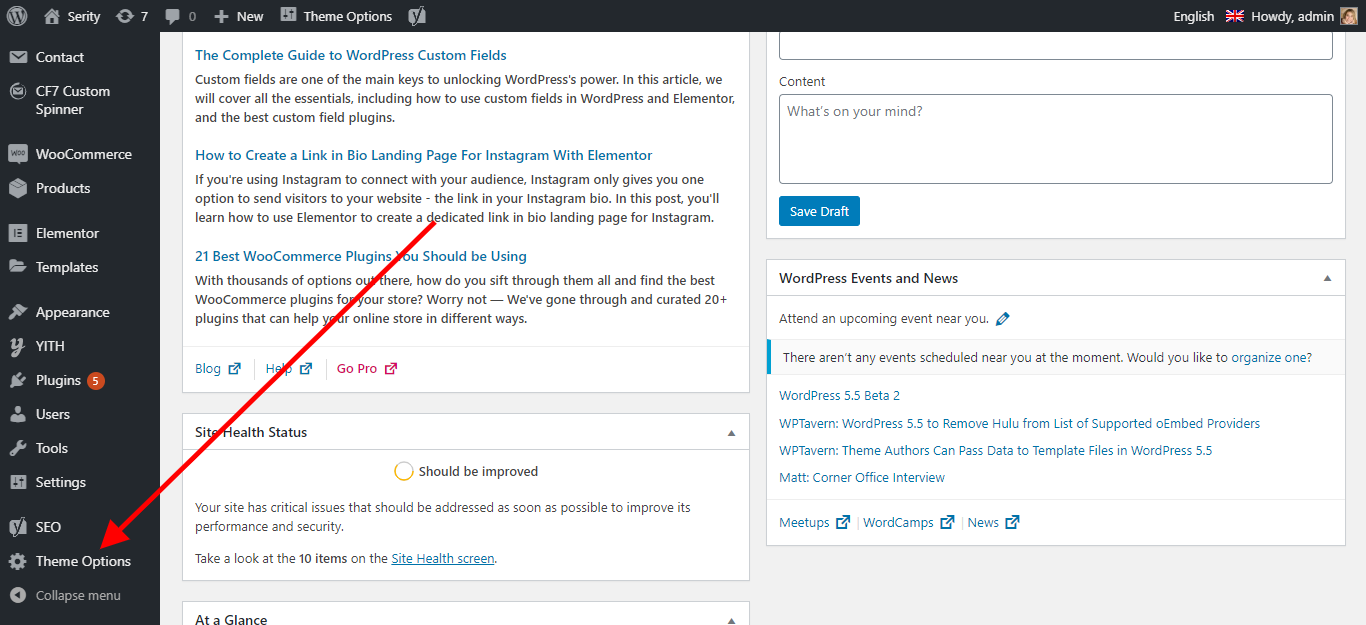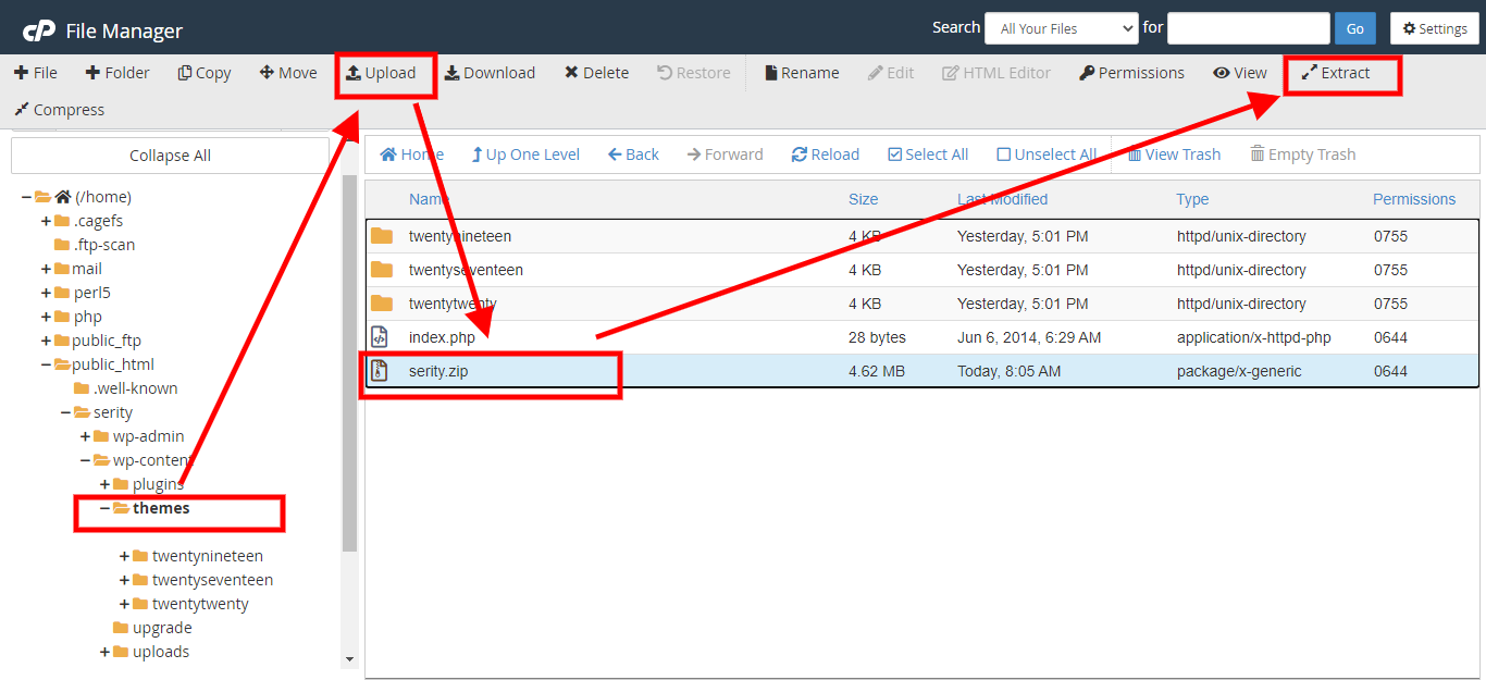 2. Upload serity.zip on server via cpanel file manager to folder "wp-content/themes" or via wp dash if your server allow big files upload