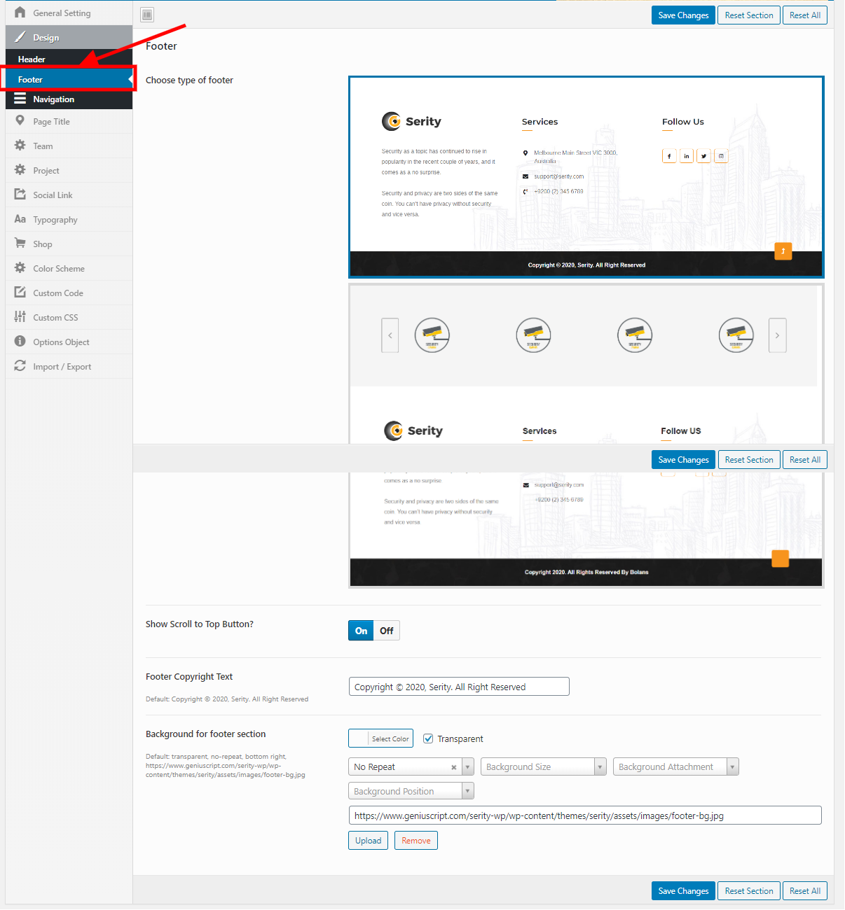 Admin -> Theme Options -> Design -> Footer