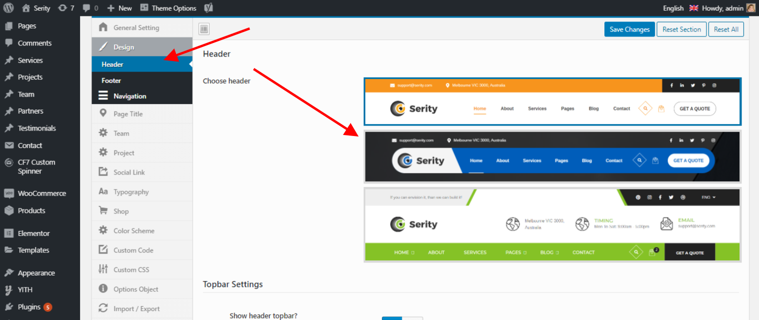 You can change the Header Footer and Main Menu Settings.