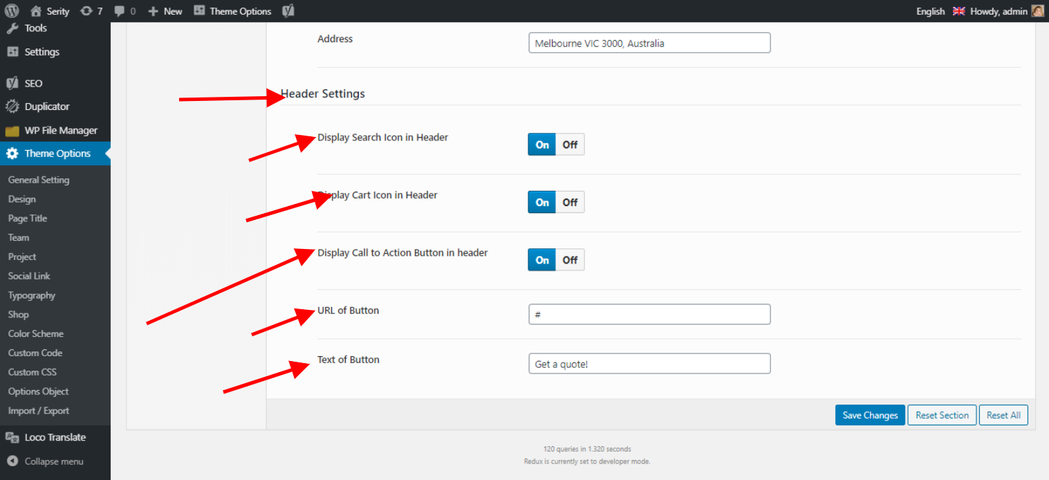 Header Search, Header Cart, Header Call to action Buttons settings