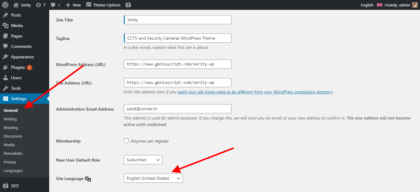 Admin->Settings->General->Site Language