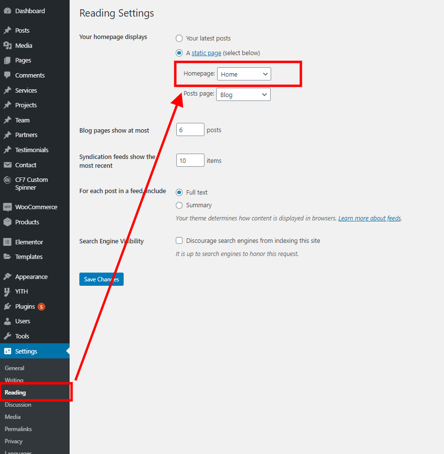 Admin->settings->reading