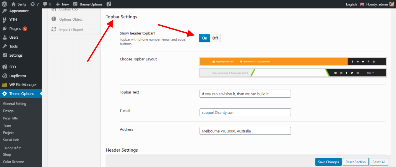 Admin -> Theme Options -> Design -> Header -> Topbar Settings
